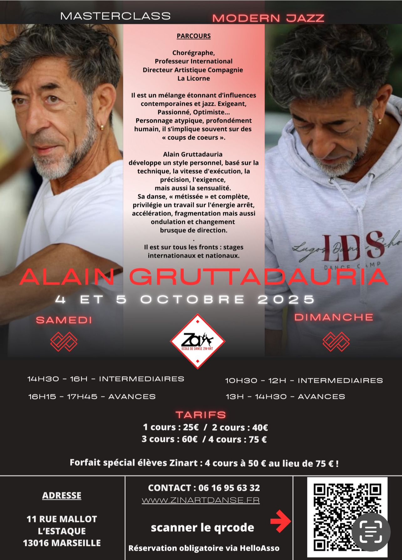 En savoir plusBonjour à tous, Cette année, l’école de danse a le plaisir de vous proposer plusieurs stages exceptionnels animés par des têtes d’affiche et chorégraphes reconnus. C’est une opportunité unique pour vos enfants (et adultes) de progresser, de découvrir de nouvelles approches et de profiter de l’expérience de grands artistes, directement au sein de l’école. 👉 Premier stage : Samedi 4 & Dimanche 5 octobre 2025 Samedi 4 octobre : 14h30 – 16h00 : Cours intermédiaire 16h15 – 17h45 : Cours avancé Dimanche 5 octobre : 10h30 – 12h00 : Cours intermédiaire 13h00 – 14h30 : Cours avancé 👉 Organisation Le stage est ouvert dès 10/11 ans, pour les niveaux débutant/intermédiaire, jusqu’aux adultes. Un cours spécifique avancé est prévu. Pour tirer le meilleur de cette expérience, je vous conseille de suivre les 4 cours. 👉 Tarifs 1 cours : 25€ 2 cours : 40€ 3 cours : 60 € 4 cours : 75€ Forfait 4 cours : 50 € (au lieu de 75 €) – réservé aux élèves de l’école zinart 👉 Inscriptions Les réservations se feront uniquement via HelloAsso afin de faciliter l’organisation et de gérer au mieux le budget (accueillir une personnalité a un coût important). Nous comptons sur vous pour être nombreux à participer et à vivre cette belle expérience. Notre premier invité est un artiste exceptionnel… vous allez adorer ! À très vite ✨ reservation obligatoire sue Hello asso https://www.helloasso.com/associations/ecole-de-danse-zinart/evenements/masterclass-alain-gruttadauria